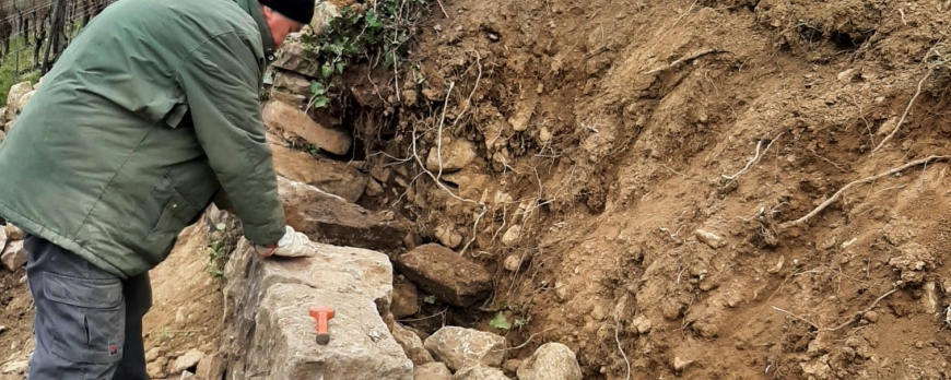 Parmi les travaux d'hiver : terrassement, restauration et reconstruction de murs en pierres sèches dans des parcelles historiques du Clos.